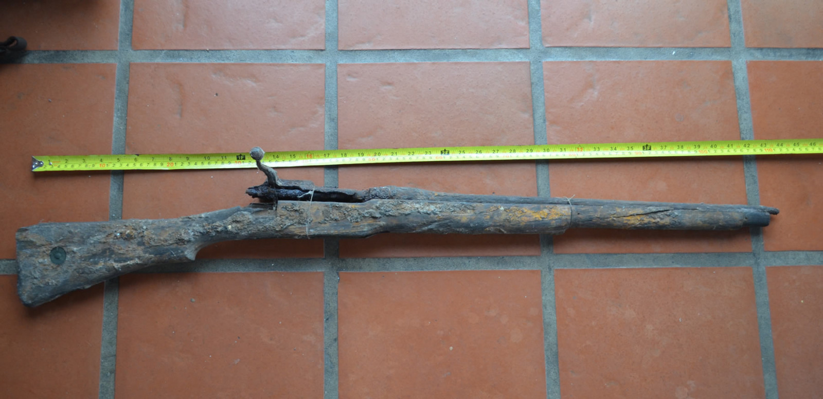 This gun was recovered by my friend John Bennett, (owner of Mother Hubbards Café in Kinsale), sometime in the 1960's and passed on to me in 2022. Unfortunately it was not treated and so much of the metal has corroded now. I believe it is one of a large batch of Russian MOSIN NAGANT M91 rifles/carbines that was originally captured by the Germans from Russia and then shipped via the AUD. (Will try and confirm as time allows.)