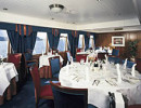 Because of her small size - 235' and a draft of 10' - the ship can visit places that would be impossible to her bigger relation - the liner. Her itinerary is very unique and the ports visited, like Kinsale, are a little off the beaten track and that is what makes the difference. Generally she plies around Scottish and Irish ports of interest and places of spectacular scenery at a stately 12 knots allowing the passengA view of the ship's dining roomser to take in the passing seascapes and shores.