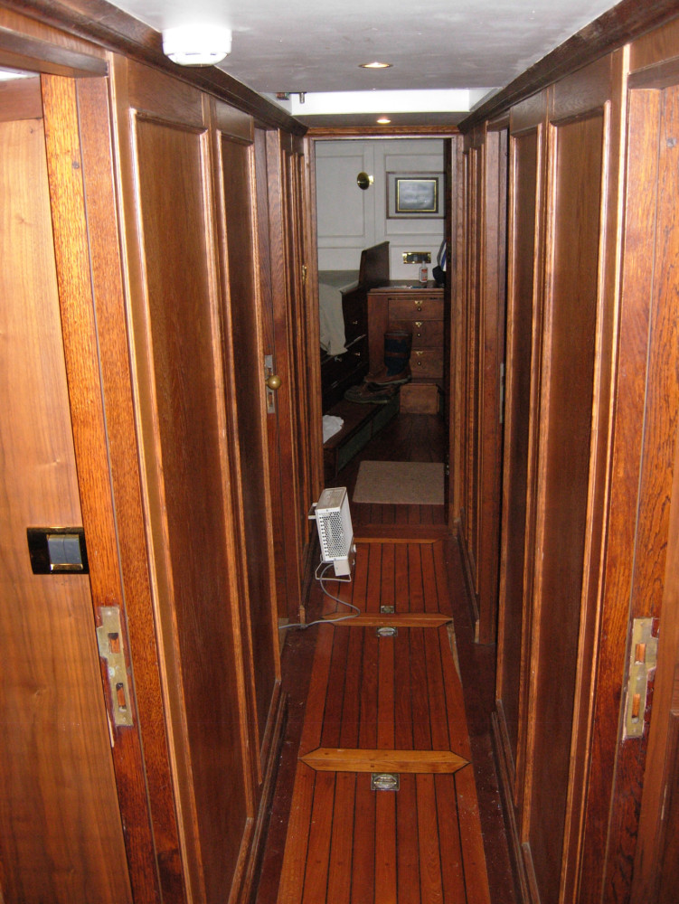 Looking aft from the main saloon there are two heads on the left, two single cabins on the right and the master cabin aft. Currently the master cabin has 2 single bunks.